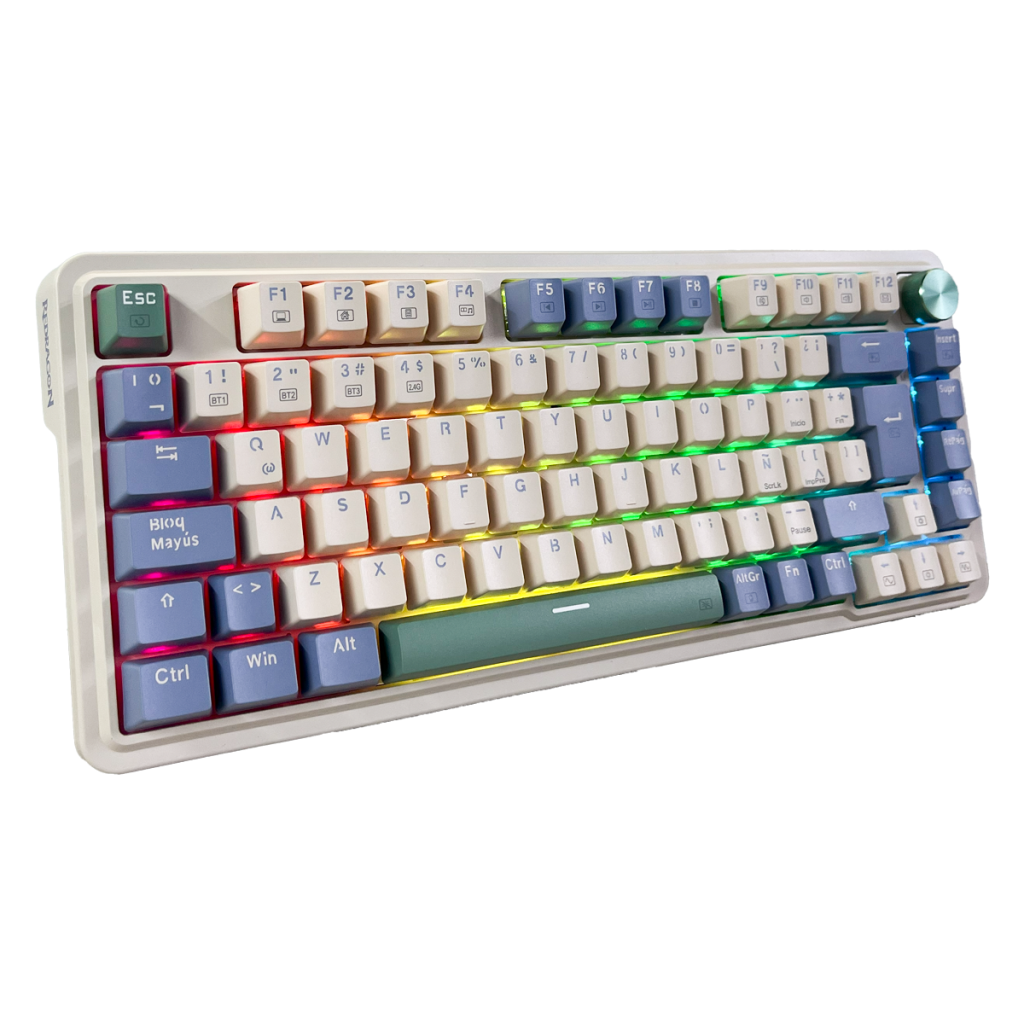• Keycaps PBT de doble disparo (mixed-color o varios colores, según versión): resistentes y permite que el RGB brille efectivamente